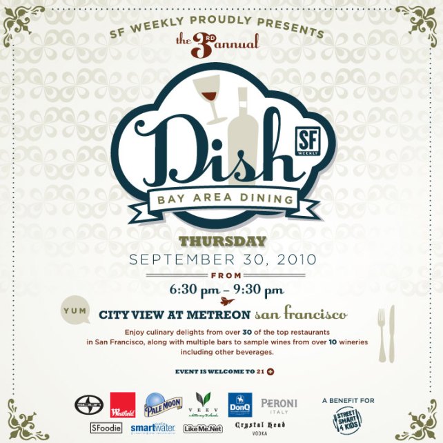This is SF Weekly’s premier foodie event, appropriately entitled DISH. It has grown in popularity since its first year in 2008 from about 400 guests to 1500 in 2009! This year plans to be even bigger. So far, we have changed the entire branding of the event by creating a new logo, along with a new design template that will be used throughout the promotions/marketing campaign.